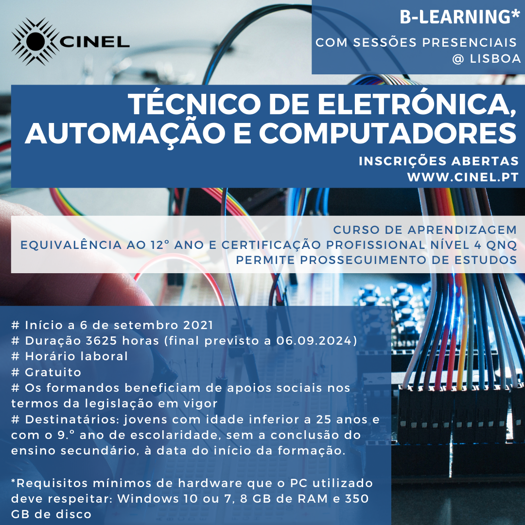 O Curso de Aprendizagem de Técnico de Eletrónica, Automação e Computadores abre a 6 de setembro de 2021, em regime b-learning, com formação presencial em Lisboa e irá decorrer em horário laboral (8h30 às 16h30).